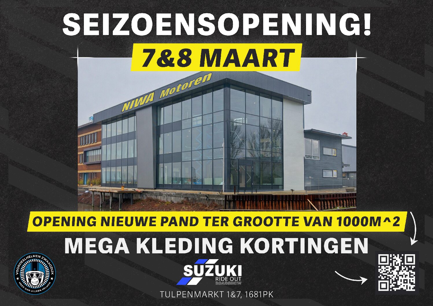 NIWA Motoren & Voordeelhelmen Zwaagdijk vieren op 7 & 8 maart een grote Seizoensopening. Bij deze seizoensopening opent NIWA de nieuwe showroom ter grootte van 1000m^2.