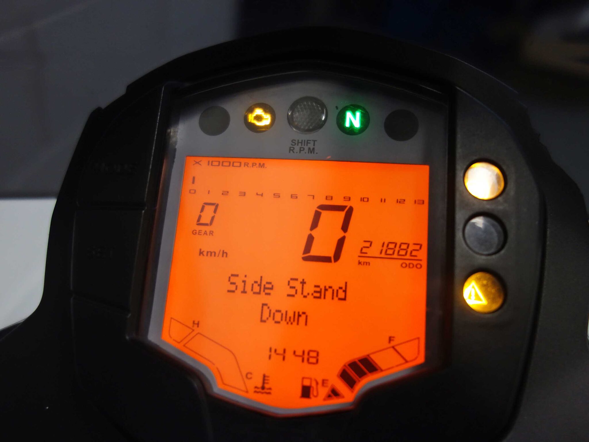Met 30 kW aan vermogen is deze motor geschikt voor het A2-rijbewijs. Dankzij het lage gewicht van 150 kg is de Duke opvallend makkelijk te hanteren, maar biedt hij toch genoeg pit voor sportieve ritten. Het blok reageert vlot en de zithouding is actief zonder oncomfortabel te zijn – ideaal voor woon-werkverkeer, stedelijke kilometers en bochtige routes.