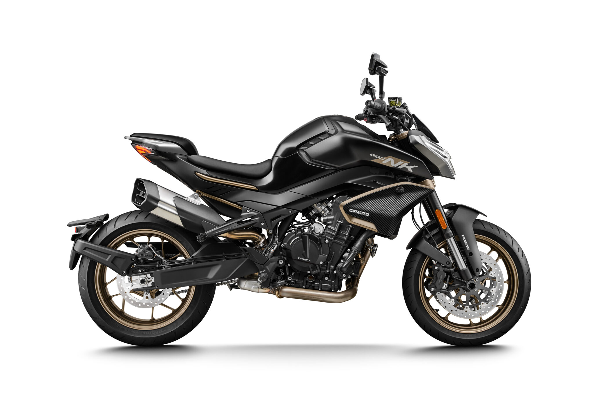 CFMOTO 800NK Sport: Het vlaggenschip van de NK-Lijn De CFMOTO 800NK Sport is het vlaggenschip van de NK-lijn: een echte straatvechter die de perfecte balans biedt tussen prestaties, comfort en een slank maar krachtig design. Met zijn 799cc paralleltwin motor, afgeleid van het KTM-platform, levert deze motorfiets indrukwekkende prestaties met 95 pk en 81 Nm. De 800NK Sport is een vat vol sensaties, ontworpen om jouw adrenaline te laten stromen.Stoer en modern design Het design van de 800NK Sport is zowel stoer als modern. Met zijn agressieve lijnen en dynamische uitstraling trekt hij gegarandeerd alle aandacht. Ondanks de sportieve looks zorgen de comfortabele zitpositie en ergonomische bedieningselementen voor een ontspannen rijervaring, zelfs tijdens langere ritten.Krachtige motor: 799cc paralleltwin De 799cc paralleltwin motor is uitgerust met dubbele balansassen en een 285° krukas, wat zorgt voor een uniek en karakteristiek geluid. De CF-SC slipperkoppeling voorkomt het blokkeren van het achterwiel bij hevig terugschakelen, terwijl de luchtfilterkast met geïntegreerde luchtinlaat onder het zadel zorgt voor optimale inlaatefficiëntie en onderhoudsgemak.Veiligheid: geavanceerd bochten-ABS Veiligheid staat voorop bij CFMOTO, en de 800NK Sport is dan ook uitgerust met een geavanceerd bochten-ABS-systeem van Bosch. De dubbele remschijven van Ø320 mm worden afgeremd door radiale J.Juan 4-zuiger remklauwen, wat zorgt voor uitstekende remprestaties en controle.Hoogwaardige vering: KYB De volledig instelbare KYB-vering vooraan biedt aanpassingsmogelijkheden voor veervoorspanning, ingaande en uitgaande demping. Ook de KYB-schokbreker achteraan is instelbaar, met opties voor veervoorspanning en uitgaande demping. Met een veerweg van 130 mm voor- en achteraan biedt de vering een sportieve afstelling zonder in te leveren op comfort.Licht maar sterk frame Het chroom-molybdeen frame is licht maar uiterst stijf, wat zorgt voor een optimale balans tussen veiligheid en stabiliteit. Doordat het motorblok als onderdeel van het frame fungeert, heeft CFMOTO het rijklaargewicht weten te beperken tot slechts 186 kg.Zithoogte: comfort en controle Het standaard zadel heeft een hoogte van 795 mm en is naar voren toe smaller uitgesneden, zodat je gemakkelijk met je voeten aan de grond kunt. Voor rijders die meer hoogte prefereren, is er ook een optioneel zadel van 820 mm beschikbaar.Sportieve velgen en banden De 800NK Sport is uitgerust met hoogwaardige MAXXIS banden op velgmaten 120/60 R17 vooraan en 180/55 R17 achteraan, wat zorgt voor uitstekende grip en sportieve prestaties.Verkrijgbaar in Zircon Black & Nebula White De CFMOTO 800NK Sport is verkrijgbaar in twee stijlvolle kleuren: Zircon Black en Nebula White. Of je nu een sportieve rijder bent of op zoek bent naar een motorfiets die prestaties en comfort combineert, de CFMOTO 800NK Sport is de ultieme keuze. Domineer de straat en ervaar de toekomst van naked bikes!