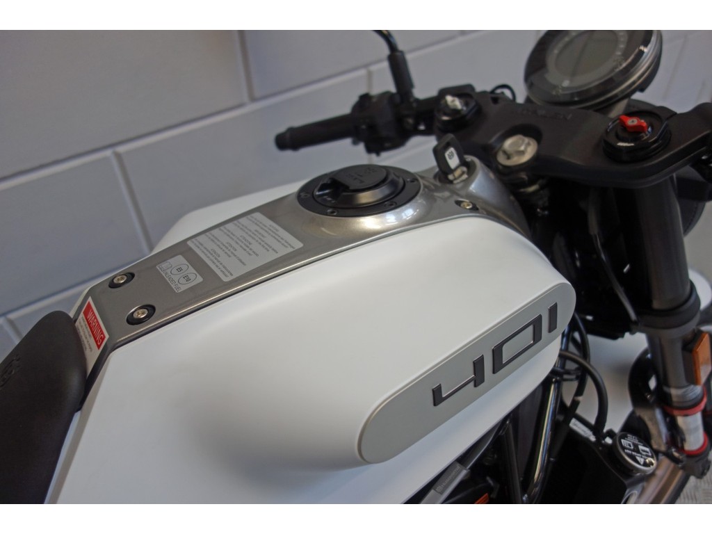 Het gaat hier om een overjarige Vitpilen 401. De Vitpilen 401 is een bescheiden held in de sub-500 cc-wereld. Zijn onwankelbaarheid, lichte gewicht en meeslepende rijpositie toveren een glimlach onder elke helm. Je rijdt er niet zozeer op als dat je vederlichte duwtjes in de goede richting geeft. Hij reageert op de kleinste impuls, beweegt bij de lichtste aanraking en geeft informatie over elk soort wegdek door middel van het lage stuur. Het is een allesomvattende en zintuiglijke rijervaring die zowel nieuwe als ervaren motorrijders aanspreekt. De kleuren en afbeeldingen uit 2022 versterken het verbluffende uiterlijk en weerspiegelen de vooruitstrevende mix van modern denken en klassiek design, gebaseerd op het Zweedse erfgoed van het merk.