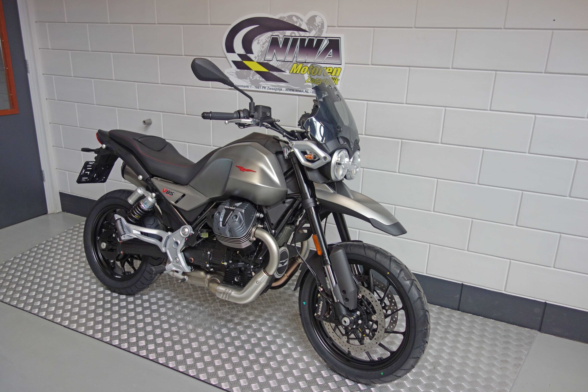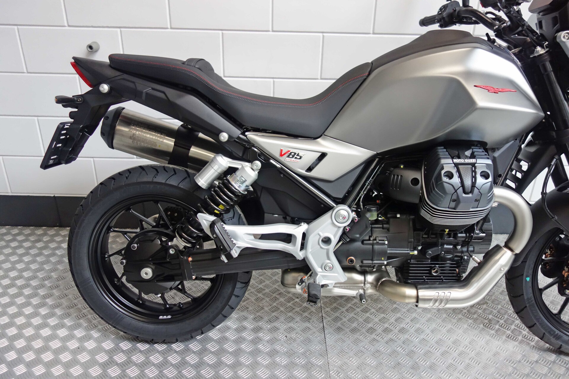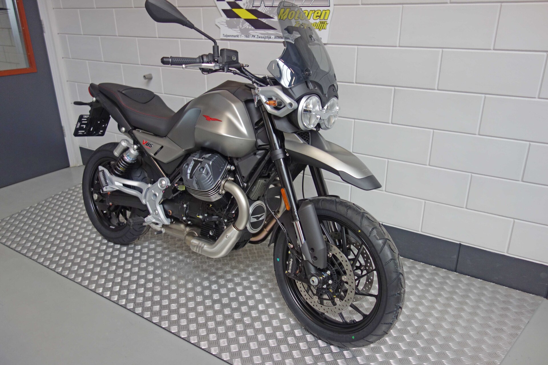 Nu tijdelijk met twee jaar extra fabrieksgarantie!Het gaat hier om de nieuwe model Moto Guzzi V85 StradaDe iconische en direct herkenbare styling van de Moto Guzzi V85 evolueert, deze keer met een meer eigentijdse interpretatie, waarbij talloze details zijn verfijnd die de authentieke charme van het oorspronkelijke model behouden.De steunen van de koplampen en het instrumentenpaneel zijn nu van gegoten aluminium, in plaats van de stalen buizen van de vorige generatie, waardoor de topkuip een sportievere en dynamischere uitstraling krijgt. De nieuw ontwikkelde handgreep achter (aangeboden als accessoire voor de V85 Strada) is ook van aluminium. Deze stijlvolle keuze draagt bij aan het verbeterde comfort en de ergonomie voor de passagier. De brandstoftank is een van de bepalende elementen van de V85 line-up, met zijn fraaie vormen die nu nog robuuster en dynamischer ogen. De tweecilindermotor heeft nieuwe cilinderdeksels, waarvan het ontwerp de technische upgrades van de motor benadrukt. De motor voldoet aan de nieuwe Euro 5+ emissievoorschriften en heeft veel inspanningen ondergaan om het vermogen te verhogen en de gasrespons – en dus het koppel – bij lage toerentallen te verbeteren. Dit is bereikt dankzij de toepassing van variabele kleptiming en klopsensoren. Het resultaat is een hoger maximumkoppel – 83 Nm bij 5.100 t/min – en meer vermogen – 80 pk bij 7.750 t/min – evenals meer rijplezier en een betere gasrespons, die meer flexibiliteit biedt bij lage toerentallen en hoge versnellingen. De injectie maakt gebruik van een enkelvoudig 52 mm gasklephuis, terwijl de Ride-by-Wire gasklepregeling met meerdere dimensies, een oplossing die een nauwkeurige regeling van de opening van de gasklep mogelijk maakt, niet alleen de algehele efficiëntie optimaliseert voor een soepele, rijke vermogensafgifte, maar ook het brandstofverbruik verlaagt.The De Moto Guzzi V85 Strada is de perfecte ‘praktische machine’, die uitblinkt in dagelijkse stadsritten en excursies op zowel stadswegen als buiten de stad. Hij wordt gekenmerkt door een minimalistische, elegante en kenmerkende styling, waarbij de achterkant slank en gestroomlijnd is, zonder handgrepen, en zonder de typische beschermplaat en handkappen van enduro motoren (nog steeds verkrijgbaar als accessoire). De uitrusting is ook voorzien van nieuwe aluminium spaakwielen die lichter en wendbaarder zijn, wat een positief effect heeft op het rijgedrag. De Moto Guzzi V85 Strada weegt 4 kg minder dan de V85 TT versie. Het weggerichte ontwerp wordt verder benadrukt door het lage spatbord op het voorwiel en de stijlvolle kleuren Nero Isola en Grigio Brera.
