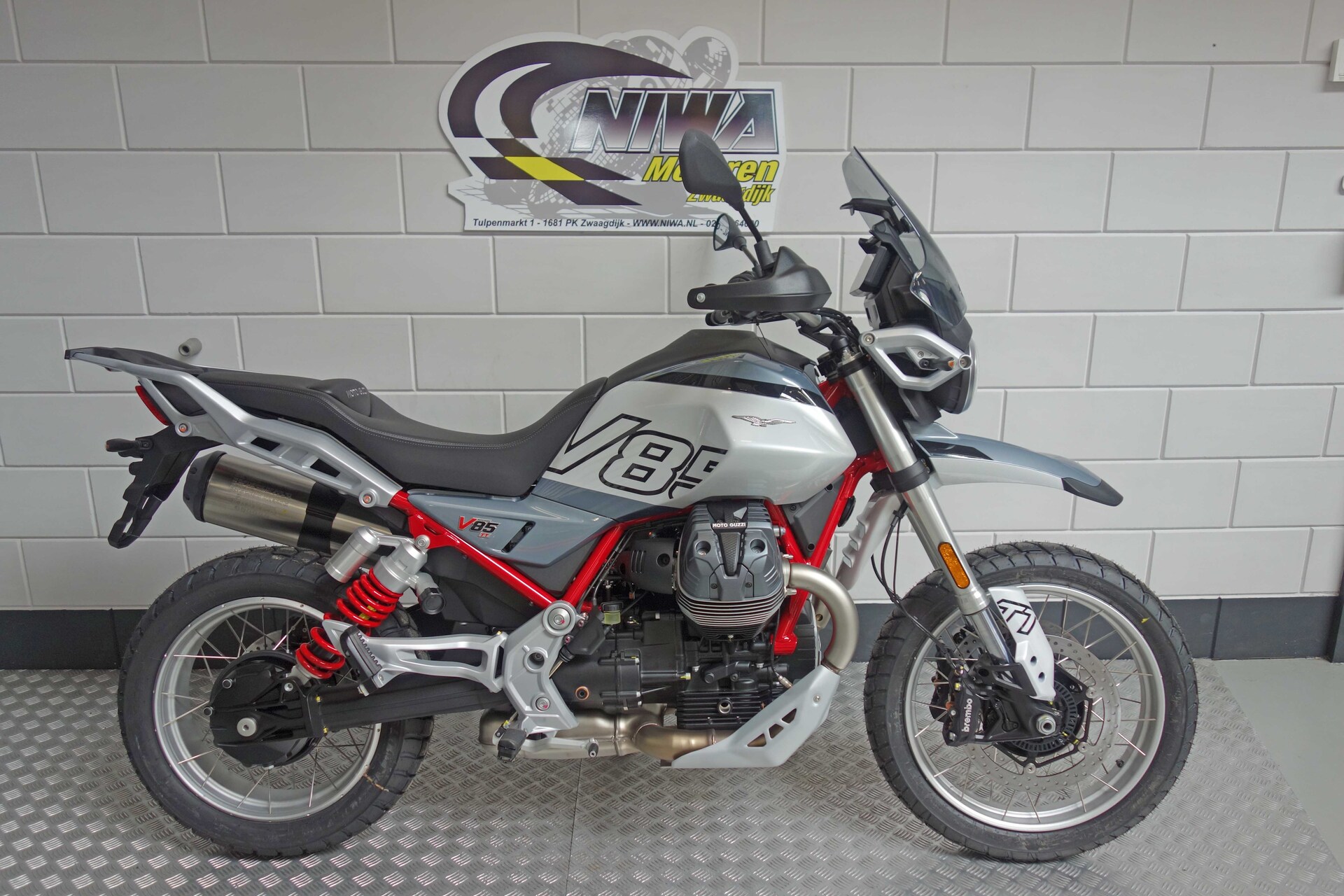 Nu tijdelijk met twee jaar extra fabrieksgarantie!Het gaat hier om de nieuwe model Moto Guzzi V85 TTDe iconische en direct herkenbare styling van de Moto Guzzi V85 evolueert, deze keer met een meer eigentijdse interpretatie, waarbij talloze details zijn verfijnd die de authentieke charme van het oorspronkelijke model behouden.De steunen van de koplampen en het instrumentenpaneel zijn nu van gegoten aluminium, in plaats van de stalen buizen van de vorige generatie, waardoor de topkuip een sportievere en dynamischere uitstraling krijgt. De nieuw ontwikkelde handgreep achter (aangeboden als accessoire voor de V85 Strada) is ook van aluminium. Deze stijlvolle keuze draagt bij aan het verbeterde comfort en de ergonomie voor de passagier. De brandstoftank is een van de bepalende elementen van de V85 line-up, met zijn fraaie vormen die nu nog robuuster en dynamischer ogen. De tweecilindermotor heeft nieuwe cilinderdeksels, waarvan het ontwerp de technische upgrades van de motor benadrukt. De motor voldoet aan de nieuwe Euro 5+ emissievoorschriften en heeft veel inspanningen ondergaan om het vermogen te verhogen en de gasrespons – en dus het koppel – bij lage toerentallen te verbeteren. Dit is bereikt dankzij de toepassing van variabele kleptiming en klopsensoren. Het resultaat is een hoger maximumkoppel – 83 Nm bij 5.100 t/min – en meer vermogen – 80 pk bij 7.750 t/min – evenals meer rijplezier en een betere gasrespons, die meer flexibiliteit biedt bij lage toerentallen en hoge versnellingen. De injectie maakt gebruik van een enkelvoudig 52 mm gasklephuis, terwijl de Ride-by-Wire gasklepregeling met meerdere dimensies, een oplossing die een nauwkeurige regeling van de opening van de gasklep mogelijk maakt, niet alleen de algehele efficiëntie optimaliseert voor een soepele, rijke vermogensafgifte, maar ook het brandstofverbruik verlaagt.De Moto Guzzi V85 TT is de “all-terrain” motorfiets die de oorspronkelijke geest van de V85 belichaamt, met een zeer suggestief uiterlijk en styling die teruggrijpt naar de sferen van de jaren 80 en de enduromotoren waarmee je alles kon doen, van alledaags vervoer tot avontuurlijke reizen. Hij is uitgerust met spaakwielen die plaats bieden aan tubeless banden van 17″ en 19″ (respectievelijk 150/70-17 en 110/80-19), maten die zelfs off-road liefhebbers tevreden zullen stellen. Bovendien wordt de motor afgeschermd door een nieuwe aluminium beschermplaat en zijn de handgrepen voorzien van verbeterde, beter beschermende handkappen. De Moto Guzzi V85 TT valt op door zijn rood gespoten frame, gecombineerd met de suggestieve tweekleurige Rosso Fuji en Grigio Tambora kleurstelling. Zelfs de veer van de achter schokdemper is rood en kan eenvoudig worden ingesteld met een handige knop.